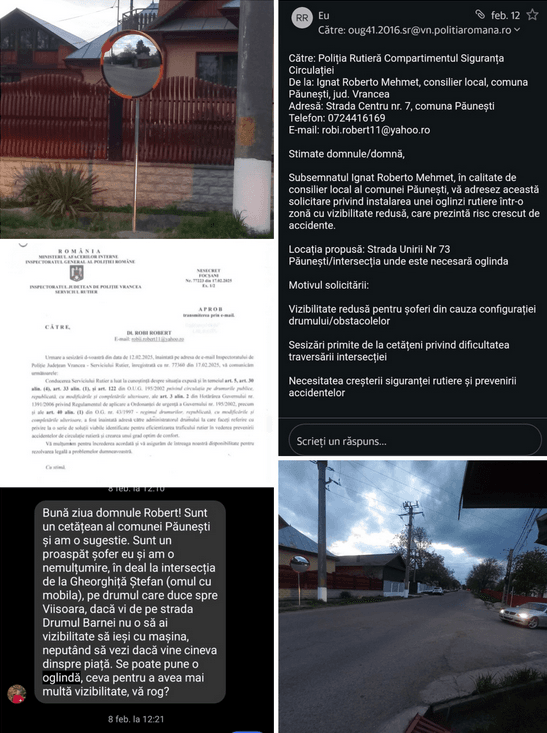 Consilierul local Ignat Roberto Mehmet anunță finalizarea primei acțiuni concrete în slujba comunității, constând în montarea unei oglinzi rutiere în zona „în deal la Ștefan”, pe strada Unirii din comuna Păunești.